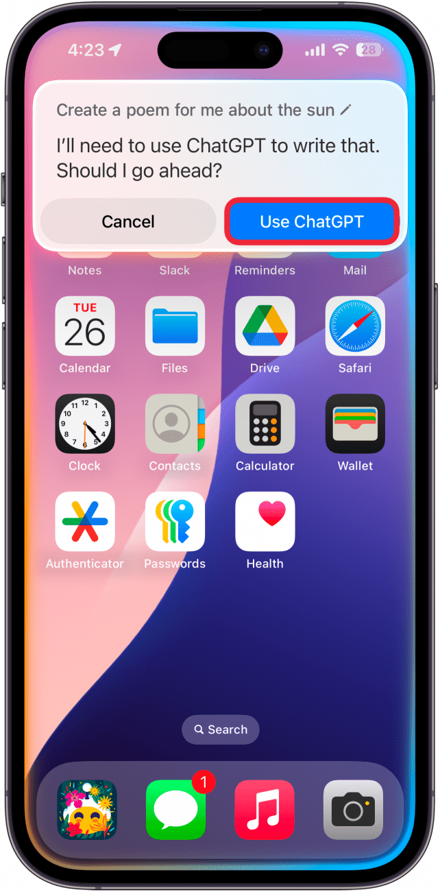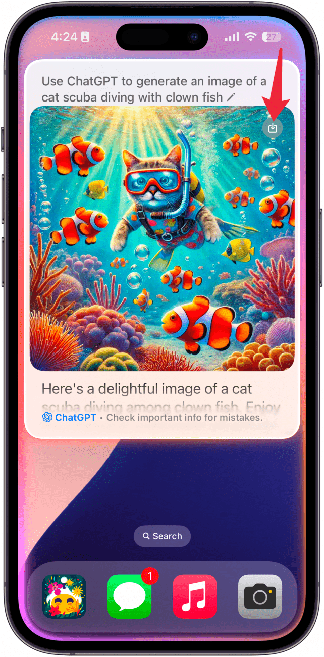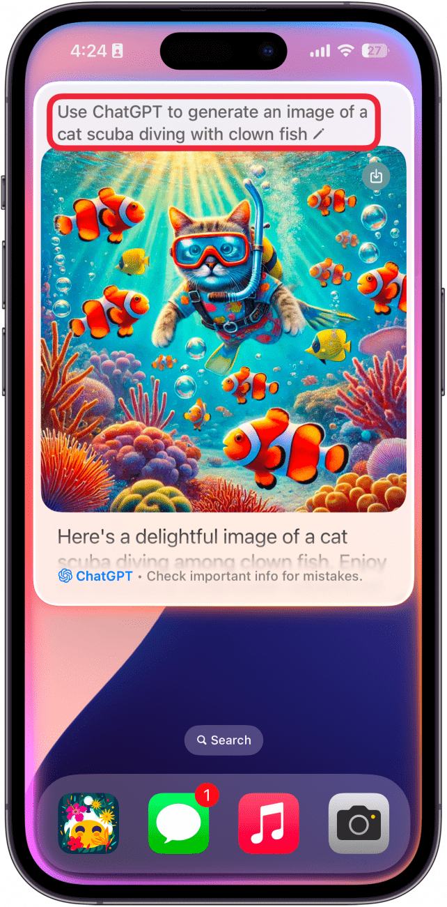 - 您還可以要求 Siri 使用 ChatGPT 生成圖像。根據我的經驗,你必須明確地說,“使用 ChatGPT 生成......的圖像”否則 Siri 只會進行網絡圖像搜索。請記住,以這種方式表達請求將繞過 ChatGPT 確認屏幕,這意味著 Siri 將在不先詢問您的情況下使用 ChatGPT。