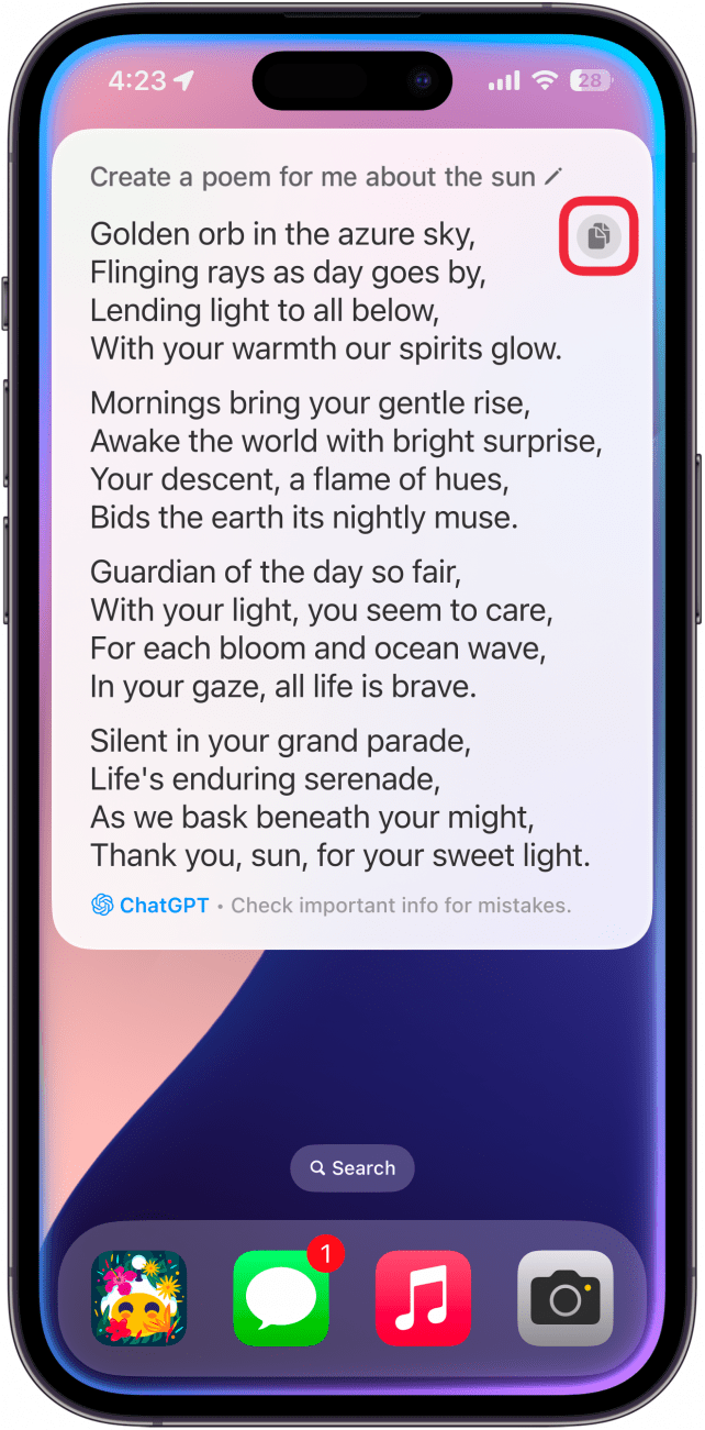 - 您可以要求 Siri 為您寫詩或其他文字段落。當您提出請求時,選擇使用ChatGPT。