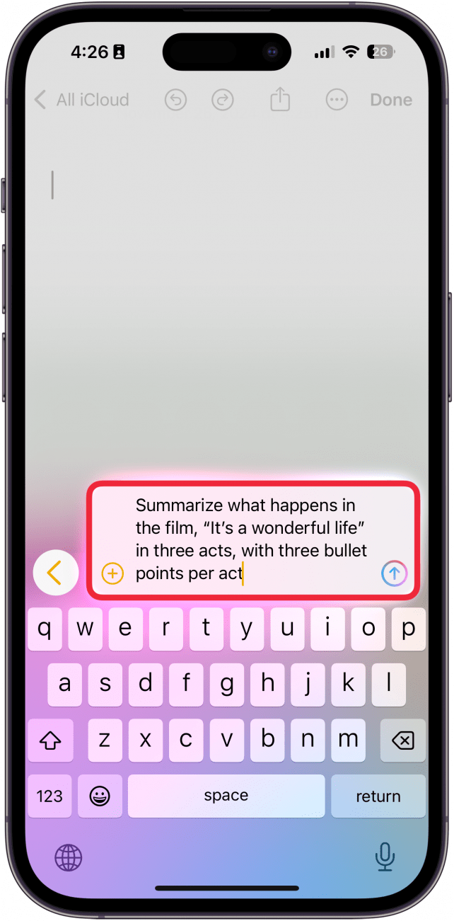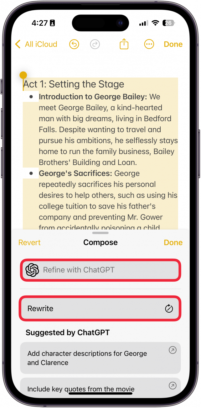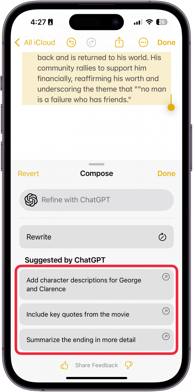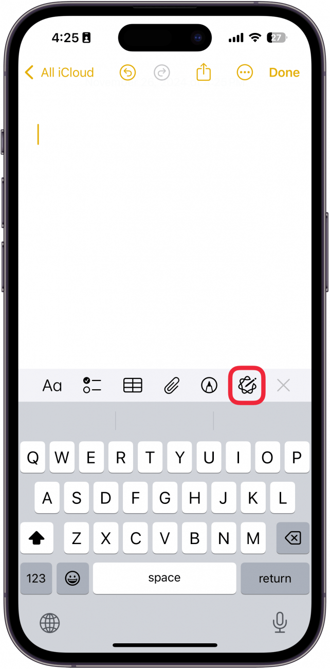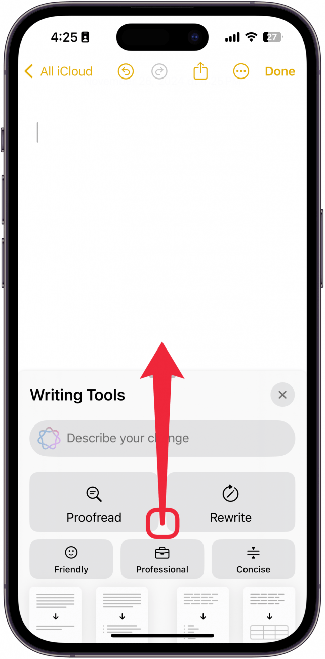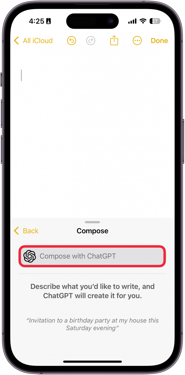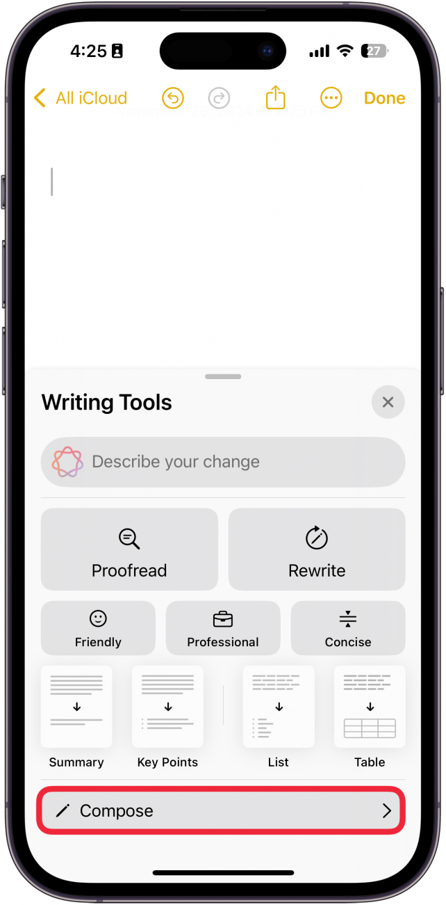 - ChatGPT 還可以與 Apple Intelligencewriting Tools 配合使用。點擊書寫工具圖標。