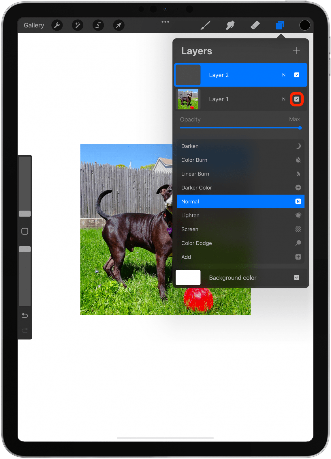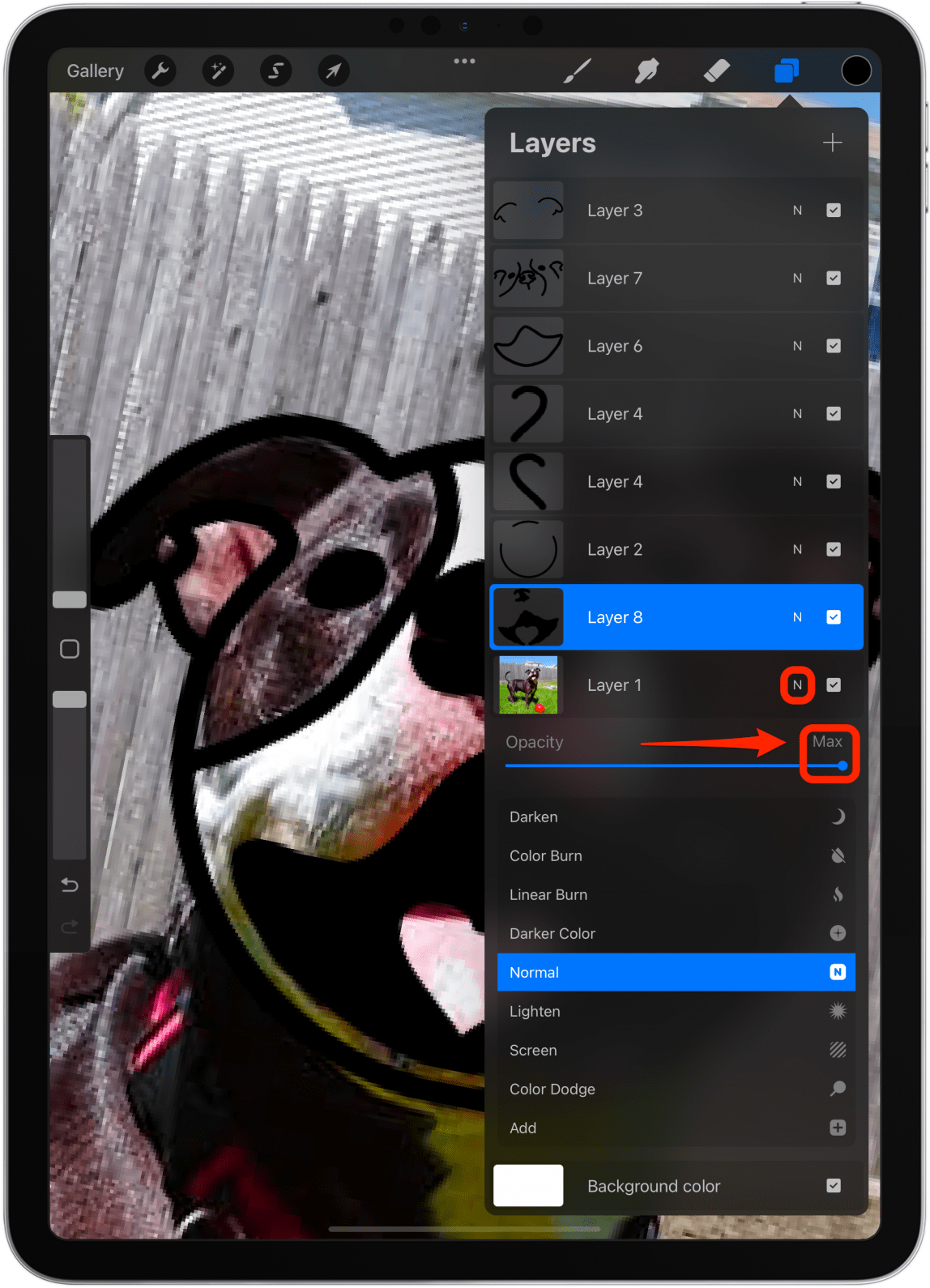 - 我將開始在新圖層中塗黑色。如果您願意,您可以調整畫筆大小或切換到不同的畫筆。在這個例子中我將繼續使用相同的。要復制並使用原始圖像中的顏色,請點擊照片圖層的 N 並將不透明度拖回最大值。
