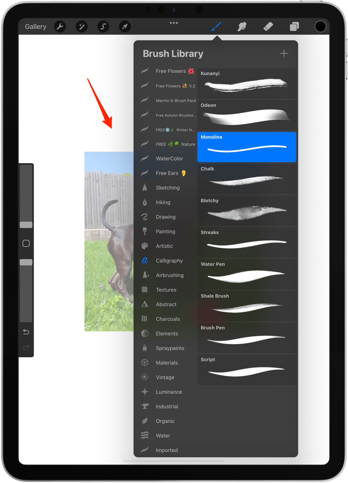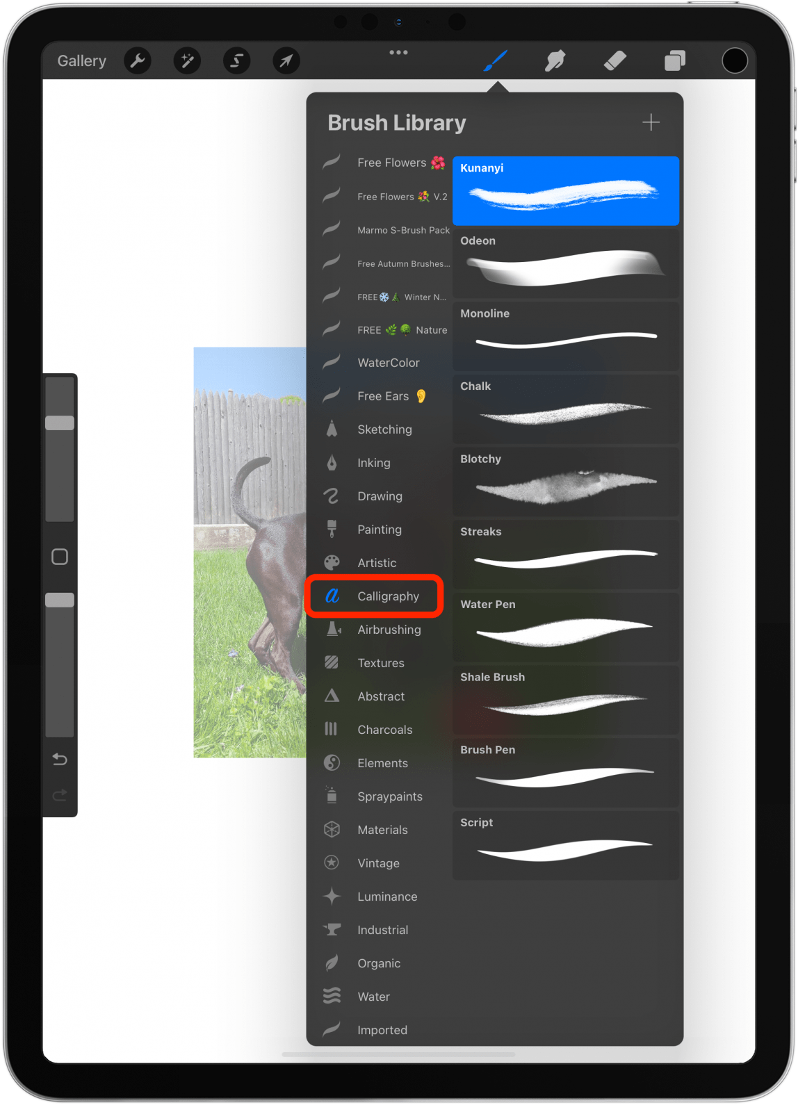 - 在這裡您將看到多種默認畫筆可供選擇。我有很多您不會在畫筆庫中看到它。有些刷子比其他刷子更容易使用。最簡單的偶數線可以在書法。