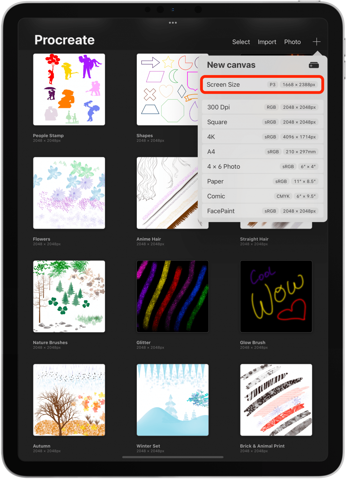 - 輕敲屏幕尺寸。我在下面鏈接的 Procreate 文章中介紹了 Canvas 尺寸調整。
