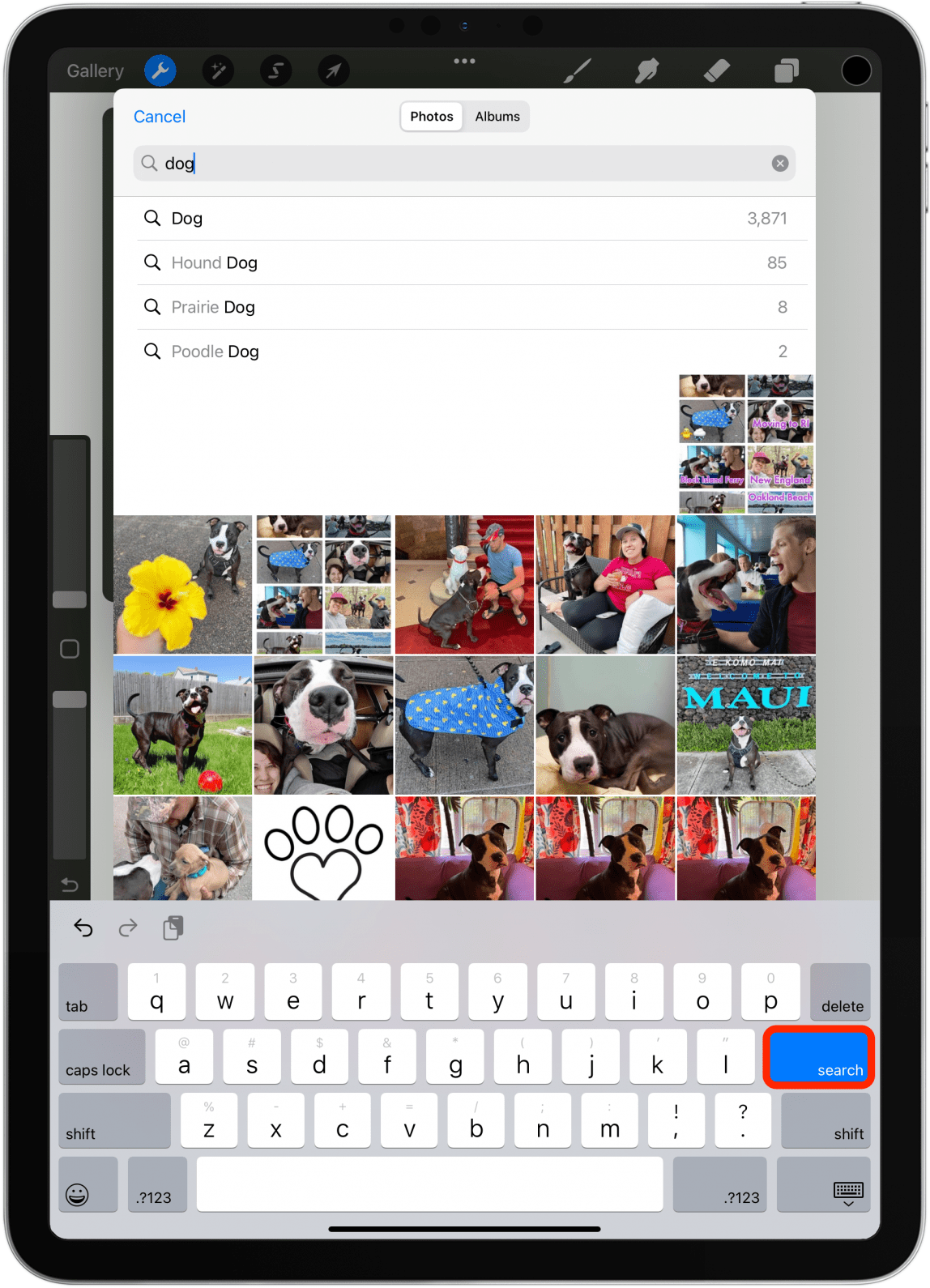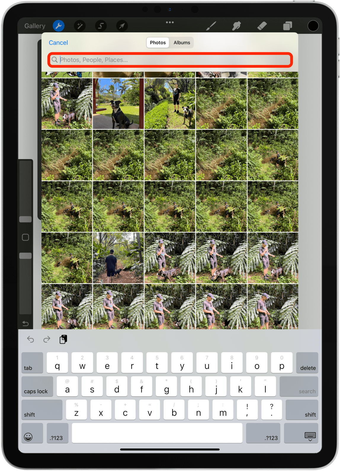 - 您可以使用搜索欄在“照片”應用程序中搜索照片,並使用鍵盤鍵入搜索詞。