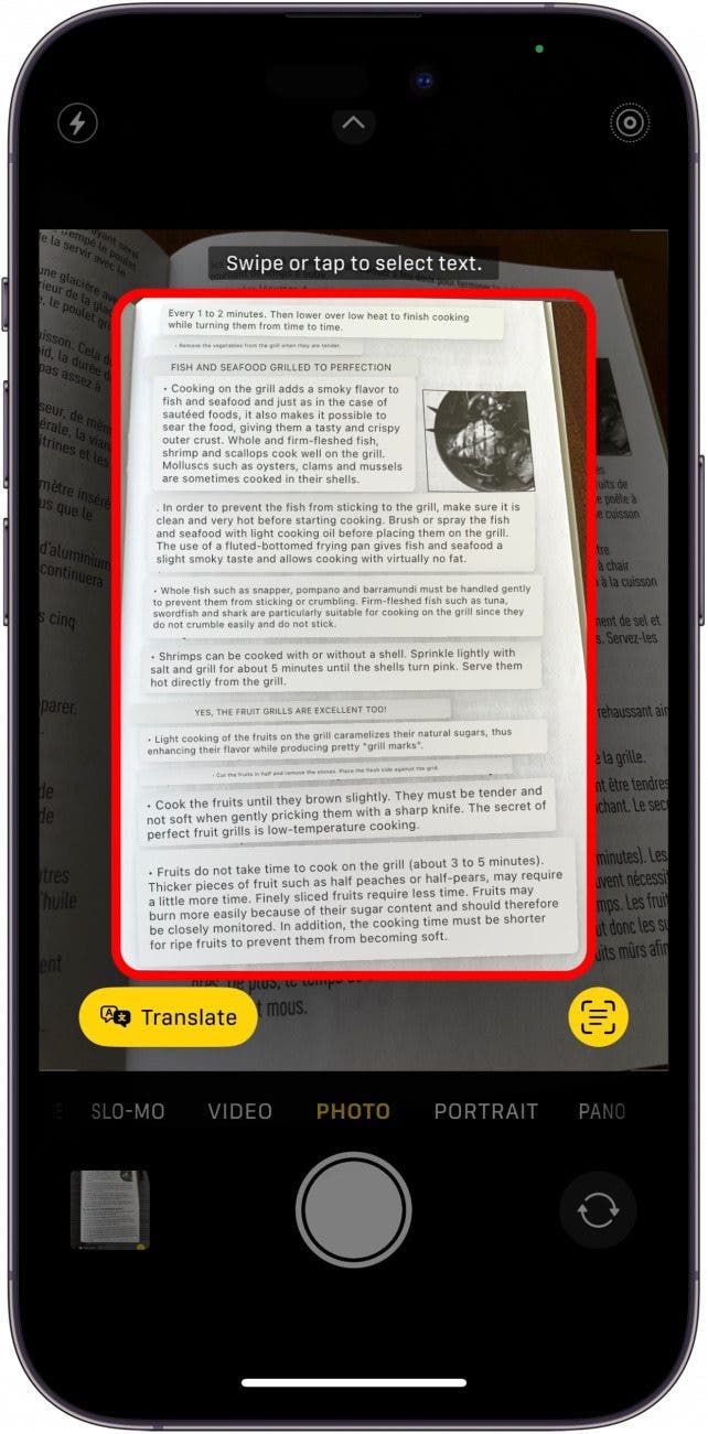 - 將相機聚焦在您要翻譯的文本上。當它聚焦時,它應該在每個角周圍用四個黃色高亮顯示文本的輪廓。點擊實時文本按鈕在左下角。