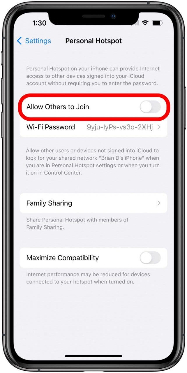如果您願意,您可以點擊 Wi-Fi 密碼來更改密碼,但密碼至少需要八個字符。如果您希望無需密碼即可連接,,如果您想讓您的個人熱點更容易找到,請參閱我們的指南。