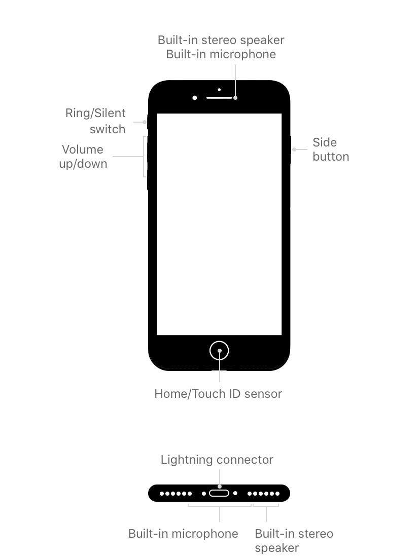 想要更了解為什麼您的 iPhone 看起來如此?如果您擁有 iPhone 8 Plus 或更早版本,請參閱以下有關外部連接埠和按鈕用途的總體概述。了解按鈕執行哪些功能以及連接埠的用途可以幫助您導航和充分利用設備。下面我展示了 Apple 支援頁面上的 iPhone 範例,以更好地解釋您的裝置。