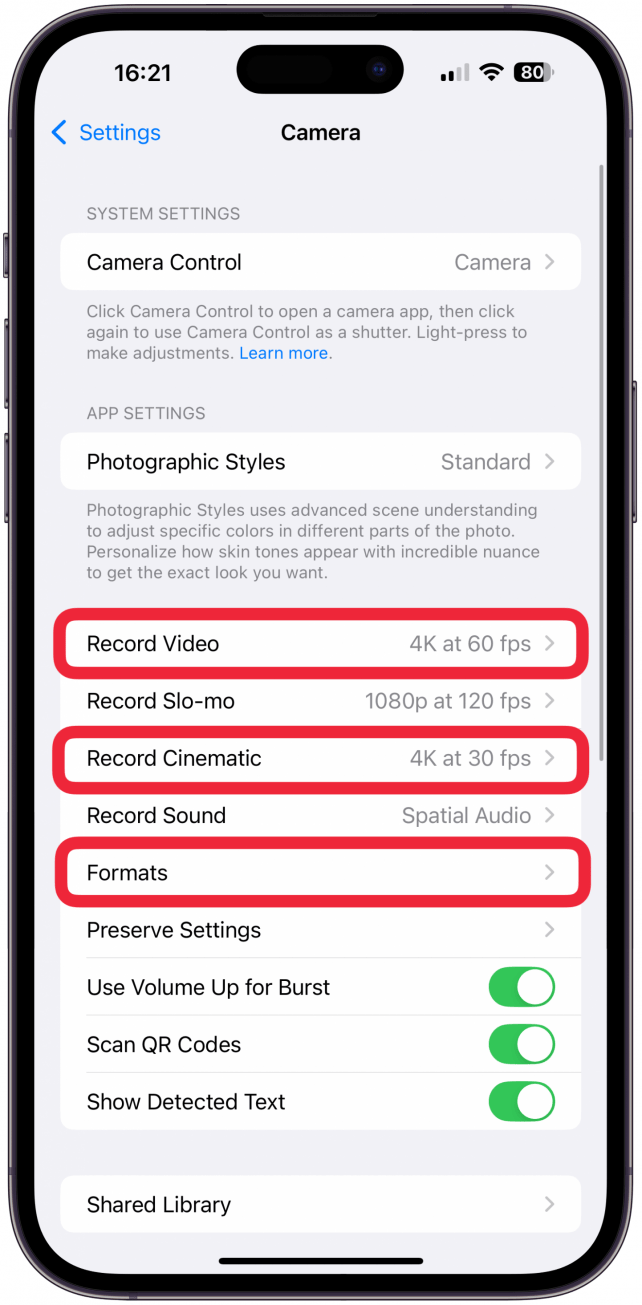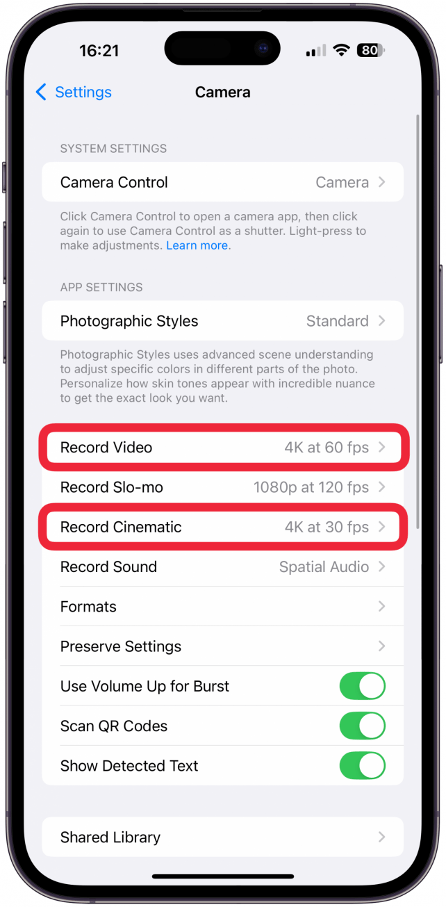 - 要獲得最佳質量的視頻,請務必點擊錄製視頻和錄製電影並在每個部分中選擇最佳質量的選項。在 iPhone 16 Pro Max 和大多數較新的 iPhone 上,4K 是最佳質量,並且首選更高的 fps。