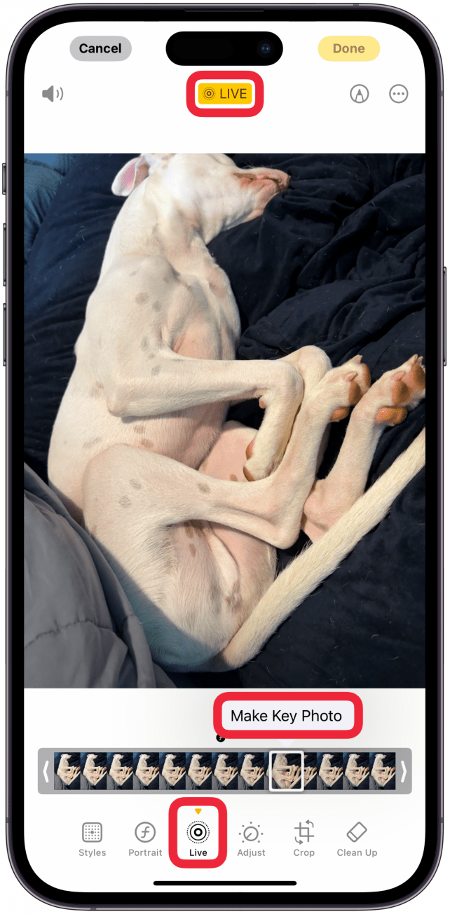 當您在照片應用程序中編輯實時照片並點擊實時時,您可以看到 3 秒鏡頭中的所有靜態照片,並且可以選擇不同的關鍵照片。雖然您的 iPhone 通常擅長選擇最佳的關鍵照片,但有時即使您的編輯設置中有更好的選項,它也可能看起來很模糊。