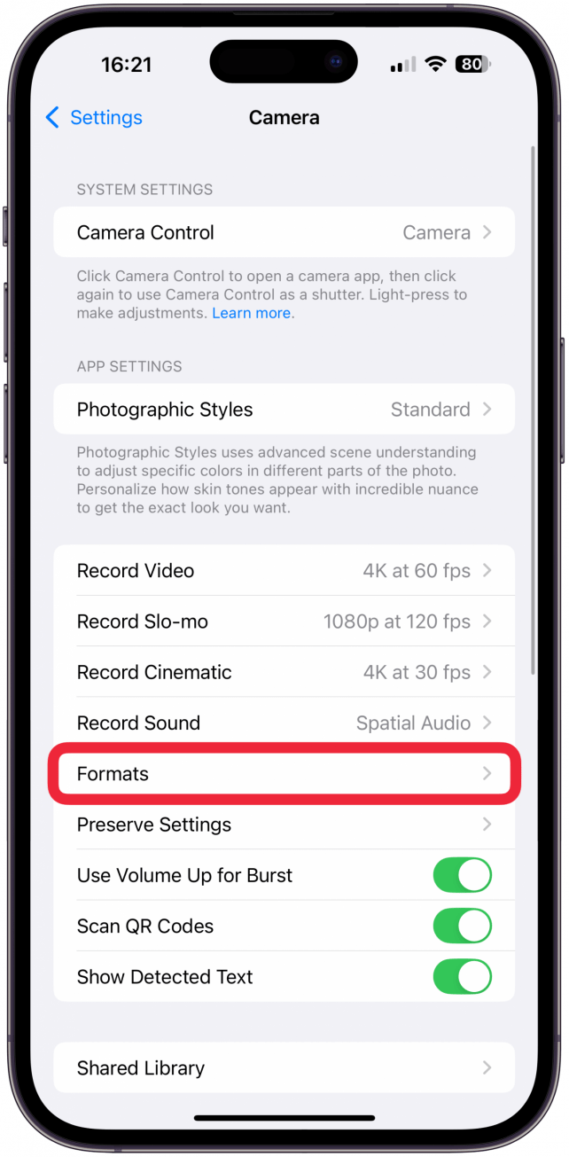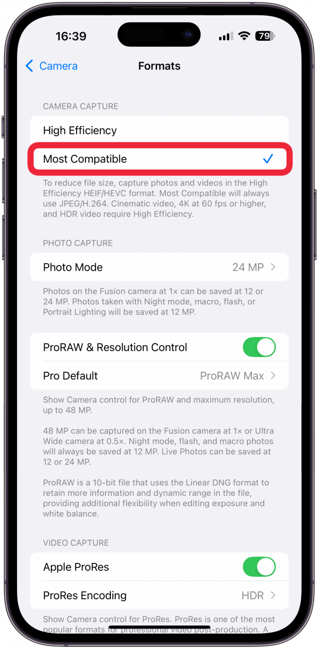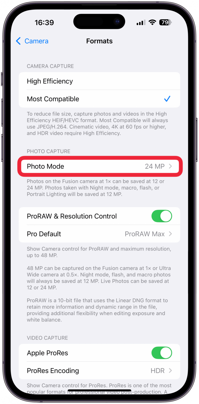 - 接下來,請確保您有24 MP被選為照片模式如果您有更新、更高端的型號,例如 iPhone 16 和 15 Pro 以及 Pro Max。