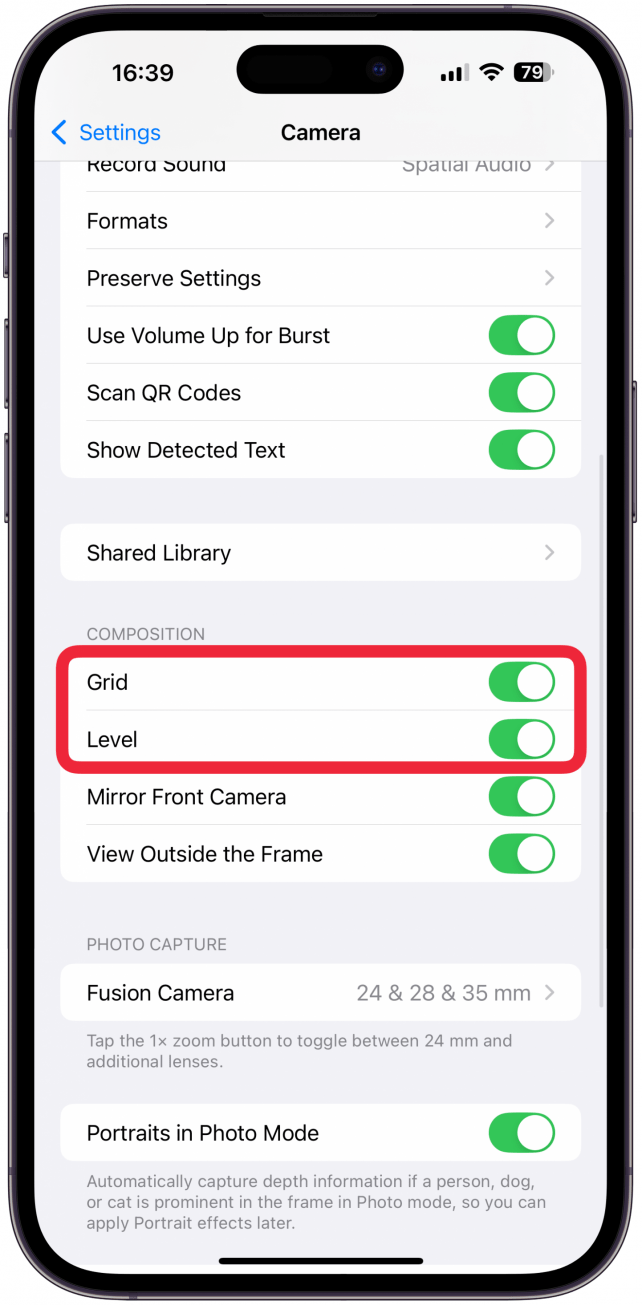 - 返回相機設置並向下滾動至作品。在這裡,確保切換 iPhone 相機網格和等級在;這將幫助您將手機穩定地固定到位,此外您還可以應用到你的攝影。