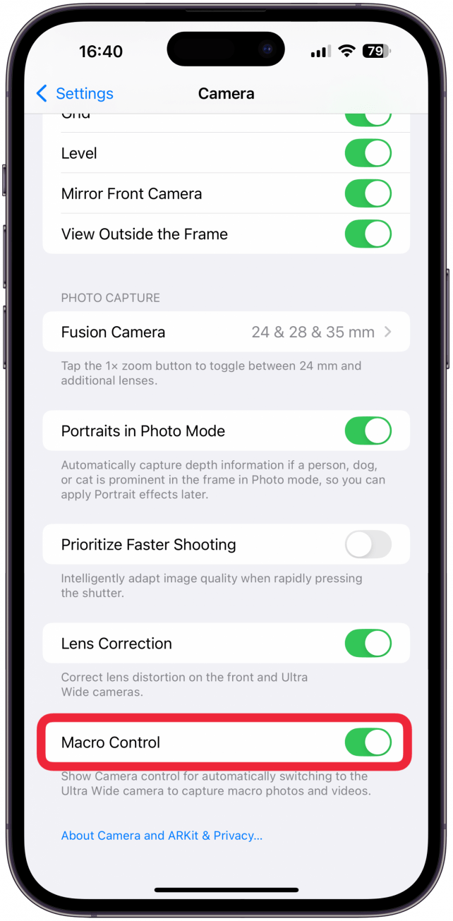 - 繼續向下滾動並確保打開宏觀調控。這使您有能力,這可以防止相機模糊甚至照片模糊。