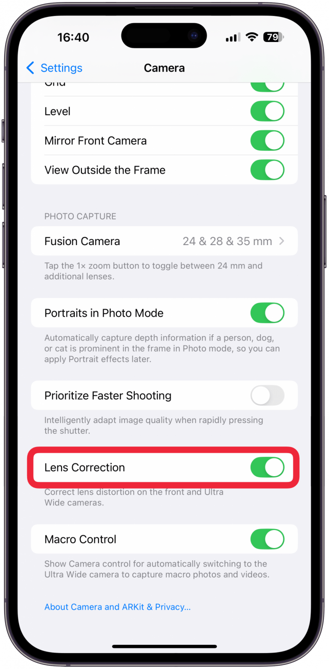 - 鏡頭校正在 iPhone 上有什麼作用?鏡頭校正是一種在 iPhone 上自動啟用的攝影設置。當您使用前置攝像頭或超廣角鏡頭(用於微距攝影)時,圖像會自動增強,避免圖像失真,使畫面看起來更自然。