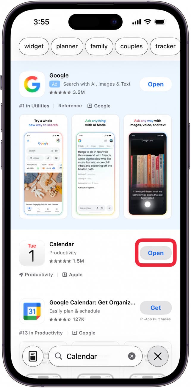 - 如果你看到打開,這意味著您的 iPhone 上已經安裝了日曆應用程序。您只需點擊打開立即使用您的日曆,稍後瀏覽您的應用程序文件夾以找到該應用程序並將其放在更容易看到的位置。這下載圖標意味著您以某種方式從手機中刪除了日曆應用程序;點擊圖標重新下載應用程序。