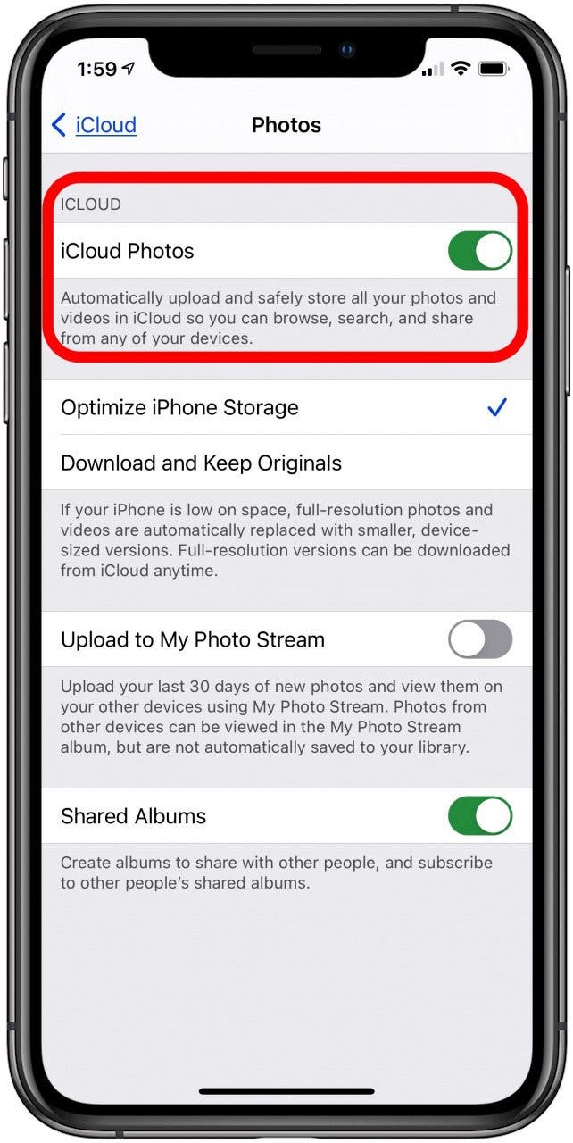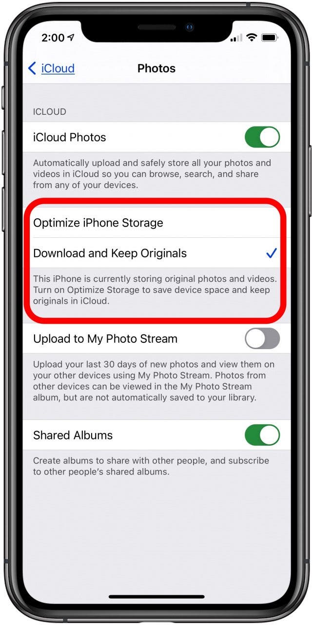 - 如果您想在 iPhone 上獲得更多存儲空間,請輕點優化 iPhone 存儲空間;此設置可讓 iCloud 照片自動管理您設備上照片庫的大小。