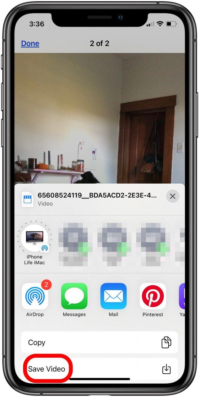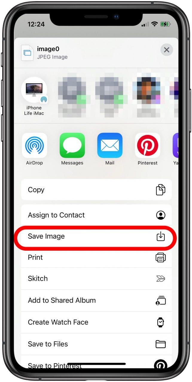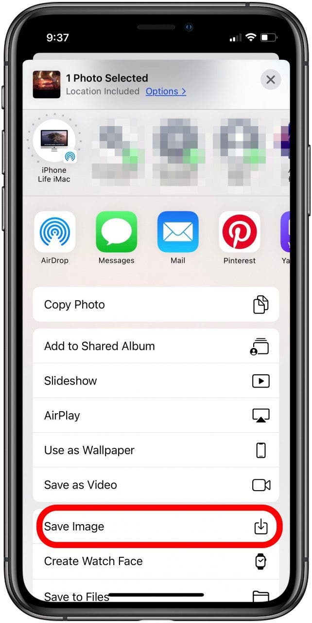 - 將出現一個菜單,其中包含通過消息、電子郵件等進一步共享照片的方法。在這些選項下方,點擊保存圖像或者保存視頻選項。