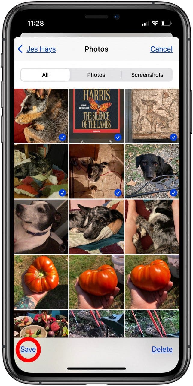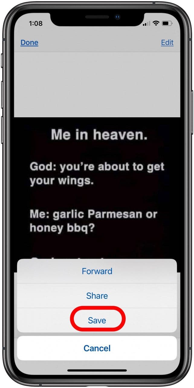 - 將出現選項,包括轉發、共享和保存照片,點擊節省。