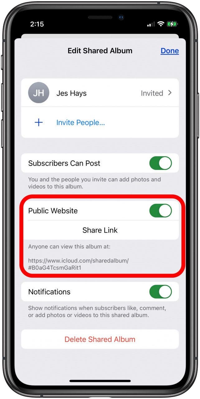 - 現在您可以點擊分享鏈接與您的聯繫人共享相冊,並且可以通過共享鏈接下面的鏈接供公眾查看。