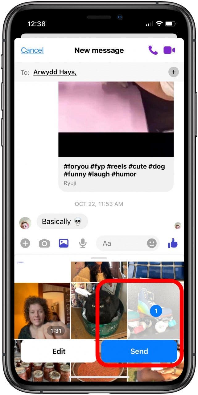 - 照片或視頻將出現在文本字段中;如果您願意,可以隨意添加文本,然後點擊發送圖標。