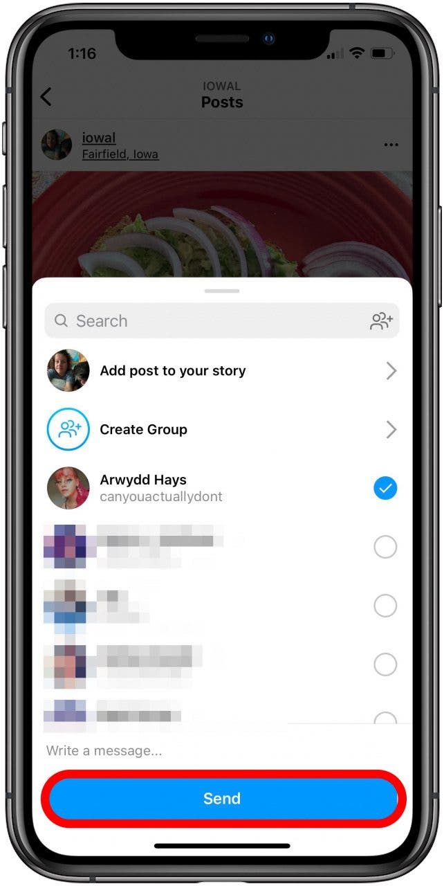 - 將出現潛在收件人列表;還有搜索聯繫人的選項。選擇一個人並點擊發送;將發送您帖子的鏈接。