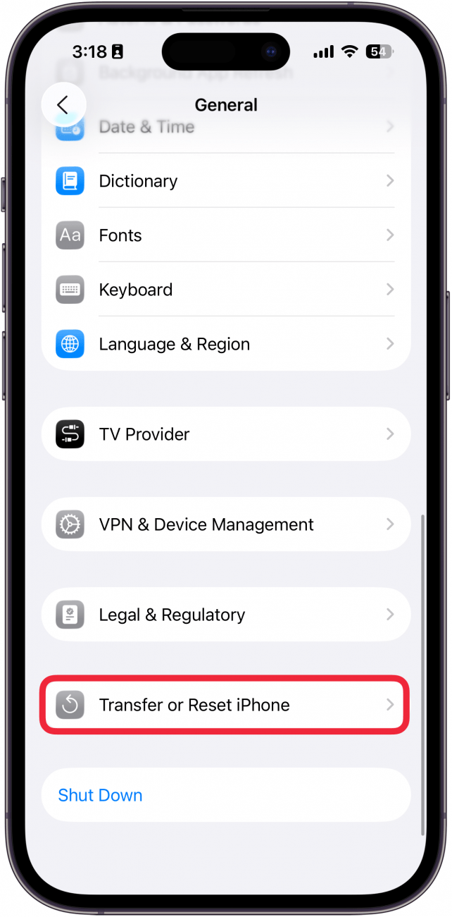 - 向下滾動到底部並點擊轉移或重置 iPhone。