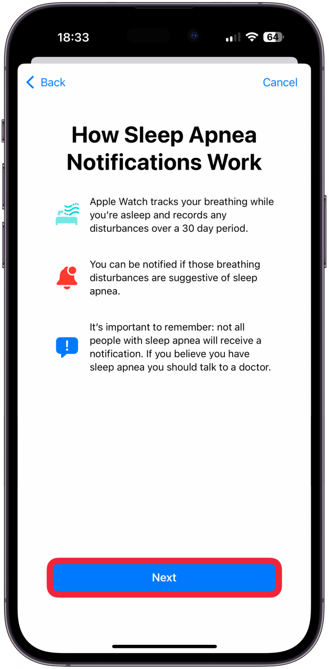 - 僅當您年滿 18 歲且尚未被診斷患有睡眠呼吸暫停時,您才能追踪睡眠呼吸暫停。如果適用,請點擊是的和不分別。然後點擊繼續。