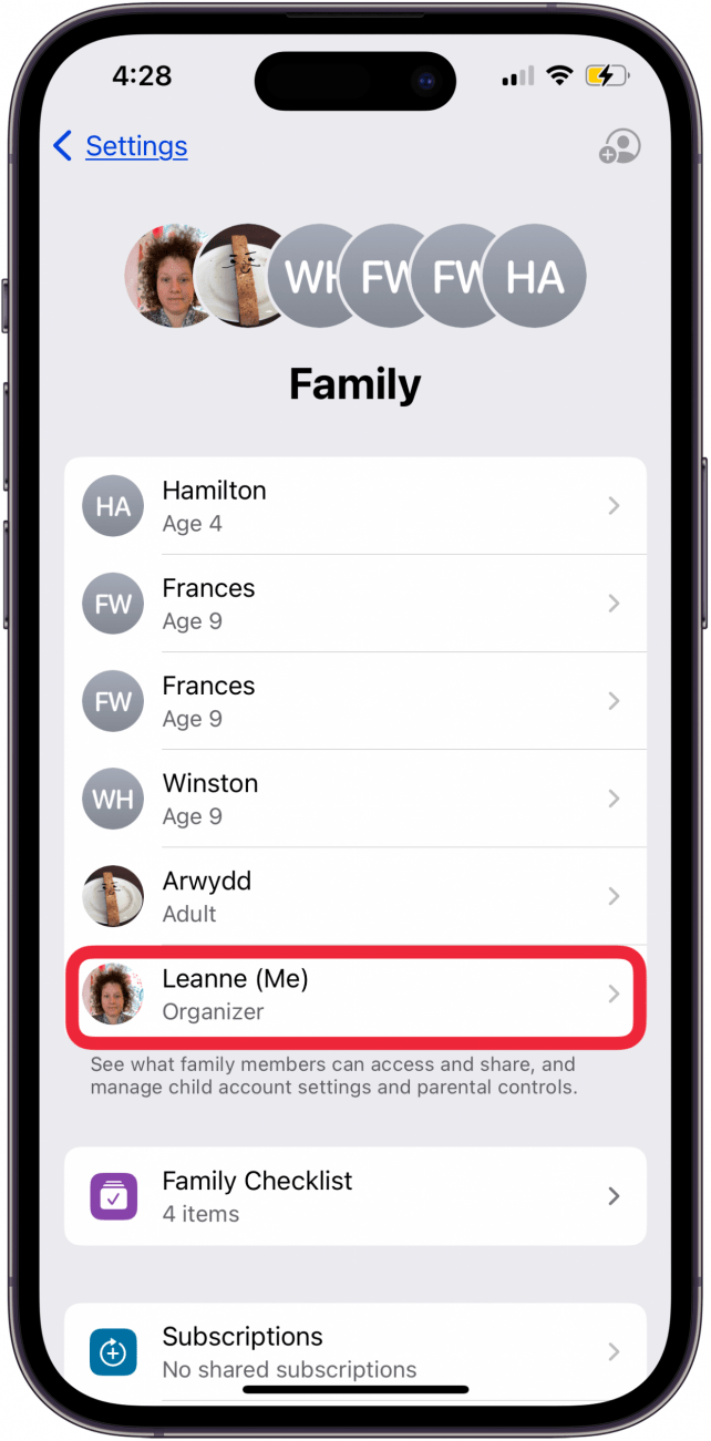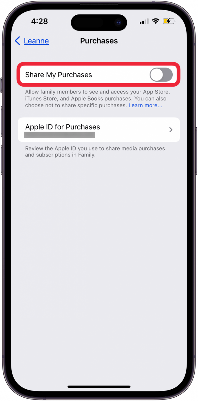- 如果您想對“家人共享”群組中的家庭成員隱藏訂閱,請打開“設置”應用,點擊“家人”、您的姓名,然後關閉“共享我的購買項目”。