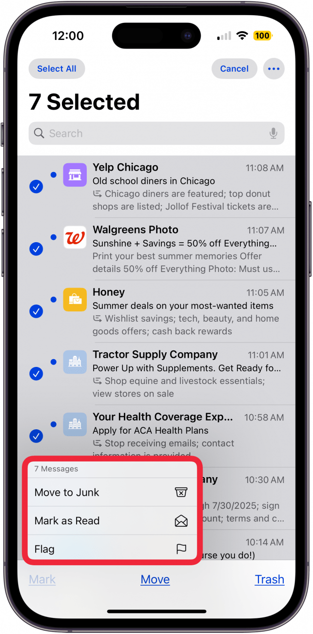 - 選擇完所有想要的電子郵件後,點擊標記,移動, 或者垃圾。