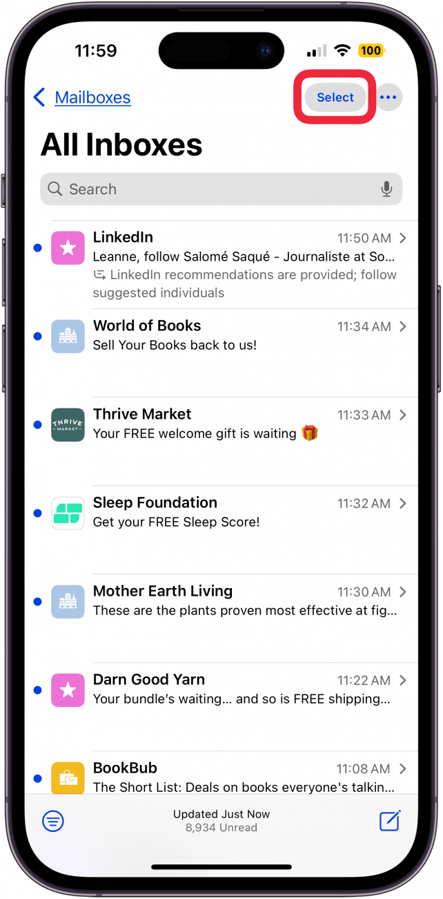 - 轉到特定收件箱或所有收件箱,然後點擊選擇在右上角。