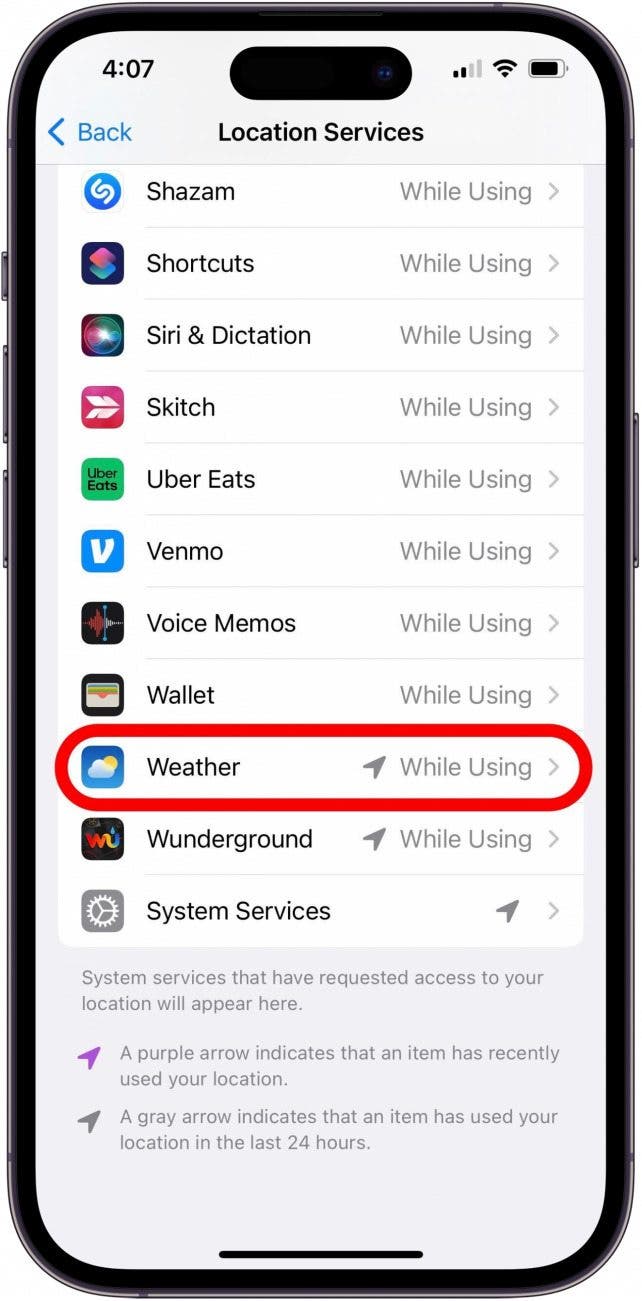- 天氣應用程序顯示的位置錯誤?打開“設置”、“隱私和安全”、“位置服務”、“天氣”,選擇“使用應用程序時”。