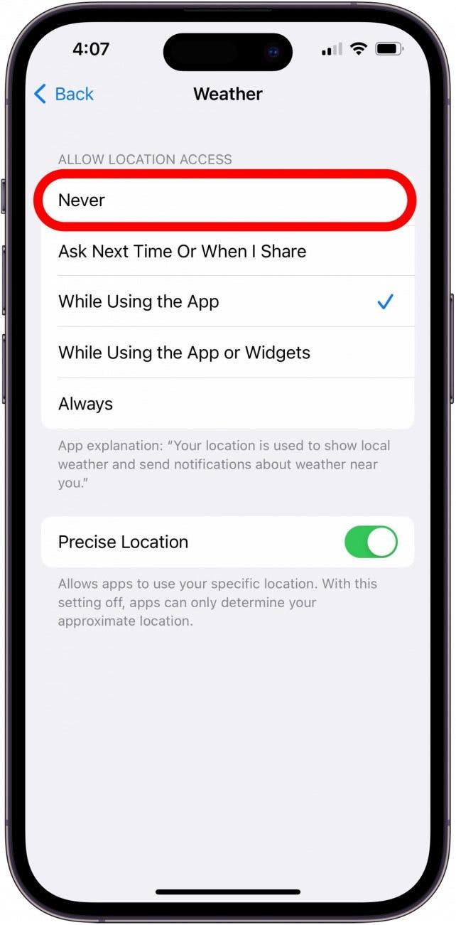 如果您不關心電池續航時間並且 iPhone 上的 Apple 天氣小部件或天氣應用程序無法運行,您可以重新打開定位服務。如果您關閉了定位服務,請記住通過添加正確的默認城市並刪除任何可能導致問題的錯誤位置來更改天氣應用程序中的位置。請按照上述步驟操作並選擇總是或者使用應用程序或小部件時根據您的喜好,在第五步下。