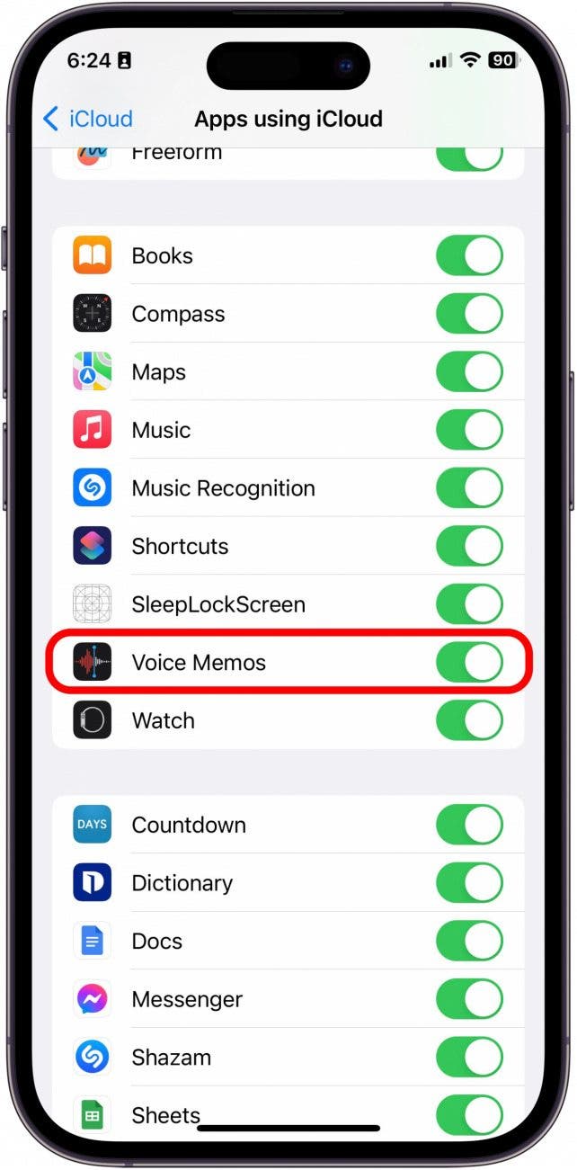 - 向下滾動直到找到語音備忘錄並確保它已打開。現在,您 iPhone 上錄製的任何語音備忘錄都將同步到您的 iCloud。