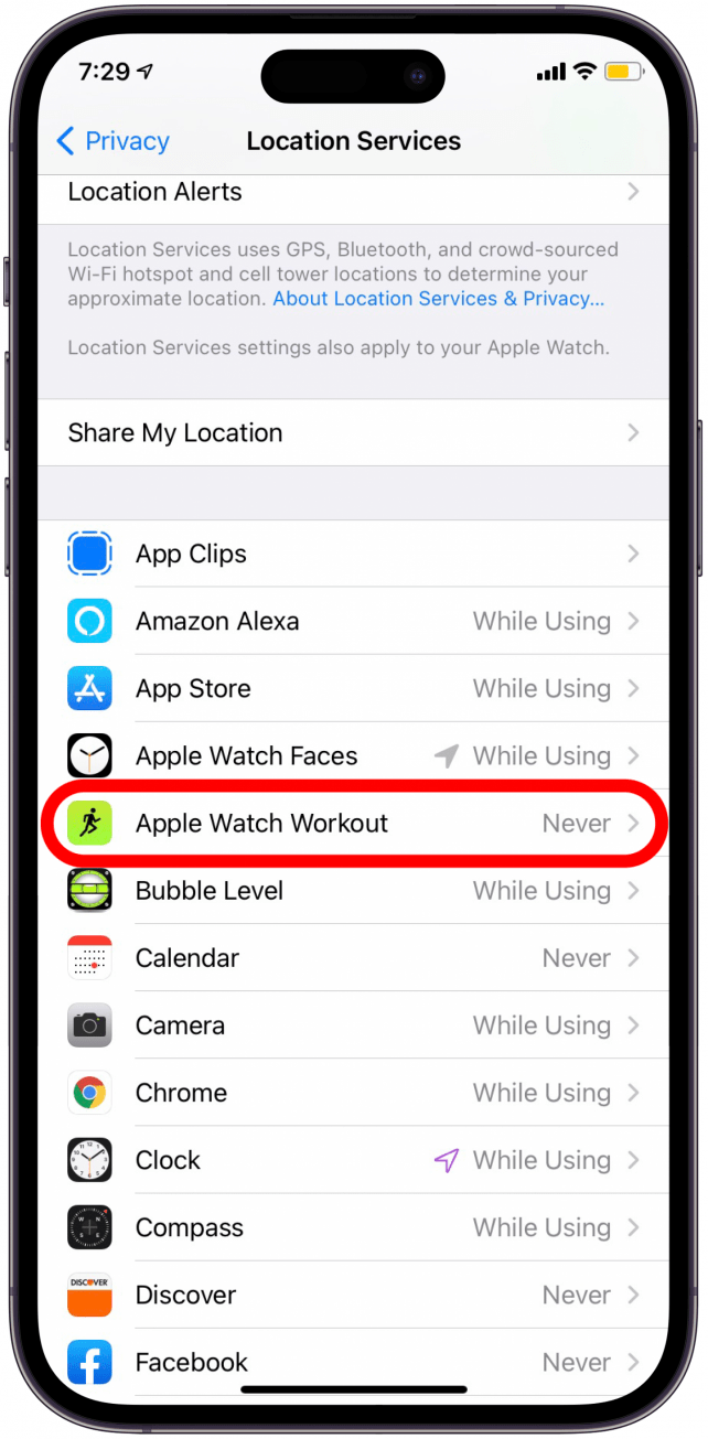 - 向下滾動並確保Apple Watch 鍛煉說“使用時”。如果沒有,請點擊Apple Watch 鍛煉。