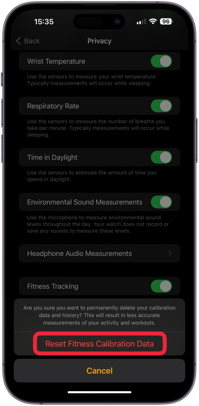 重置您的健身校準數據將擦除您的健身數據,包括所有之前記錄的鍛煉數據。僅重置健身校準數據作為最後的手段。我建議嘗試。