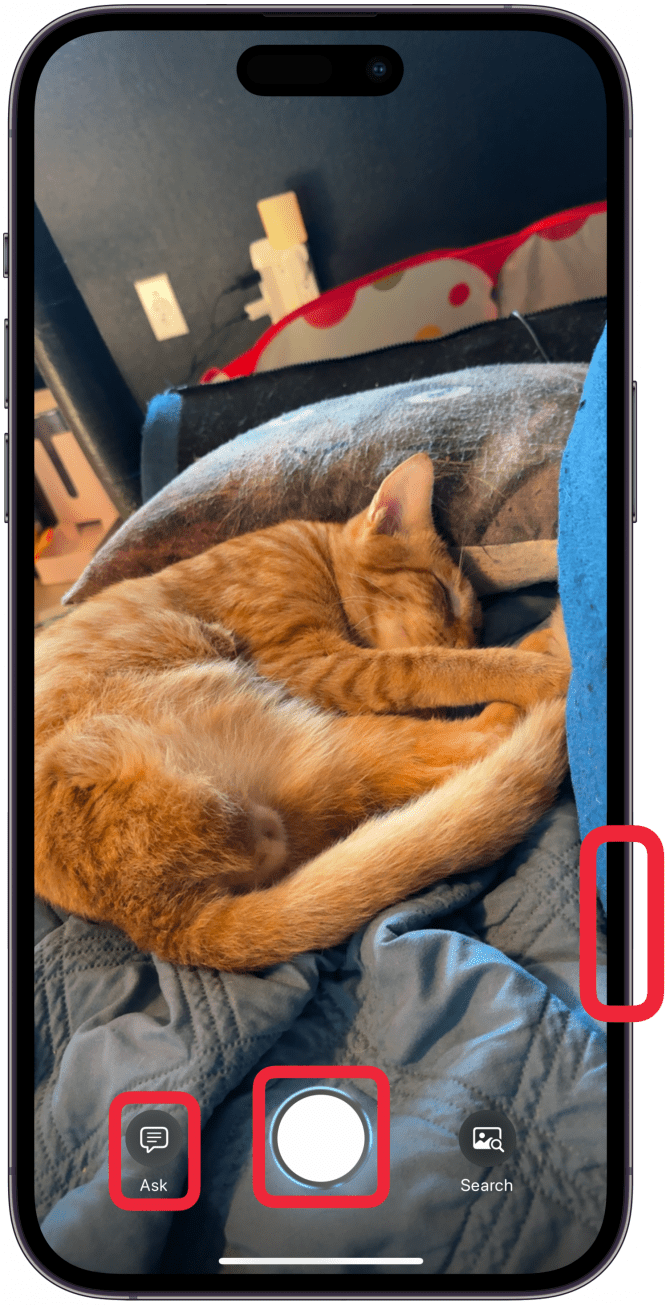 - 垂直(而不是水平)握住 iPhone 的同時,按住相機控制按鈕直到 Visual Intelligence 視圖出現。