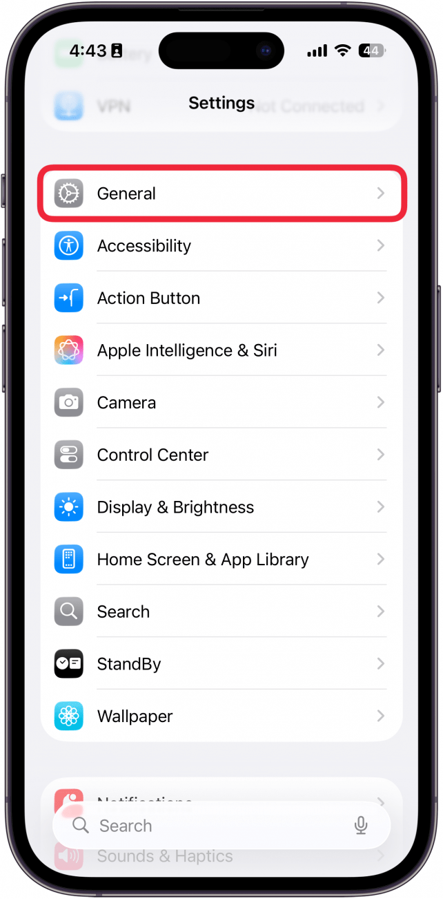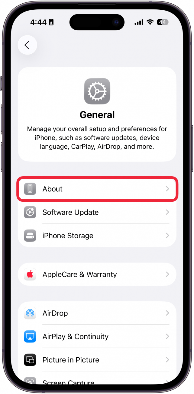 - 打開設置應用程序, 輕敲一般的,然後點擊關於,就像你在第一節。如果您看到型號部分,它可能會顯示更長的數字,而不是 A#### 格式的數字。