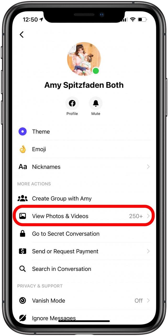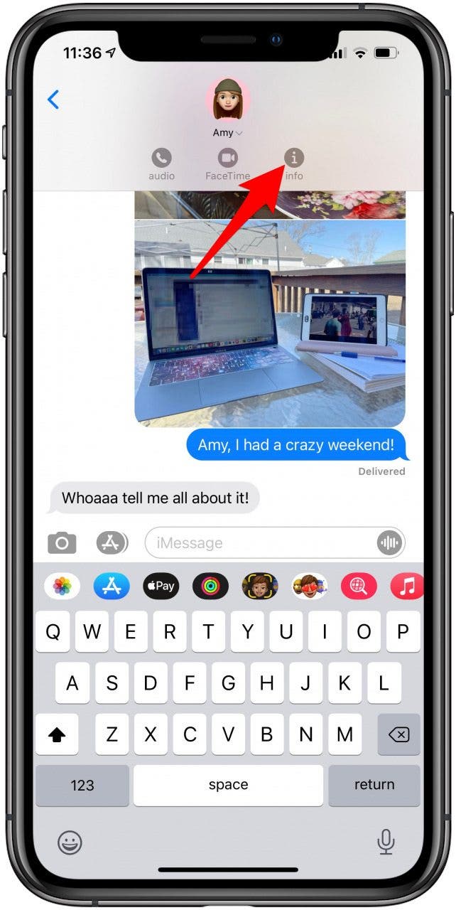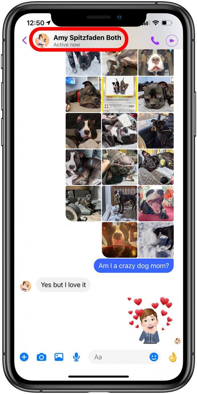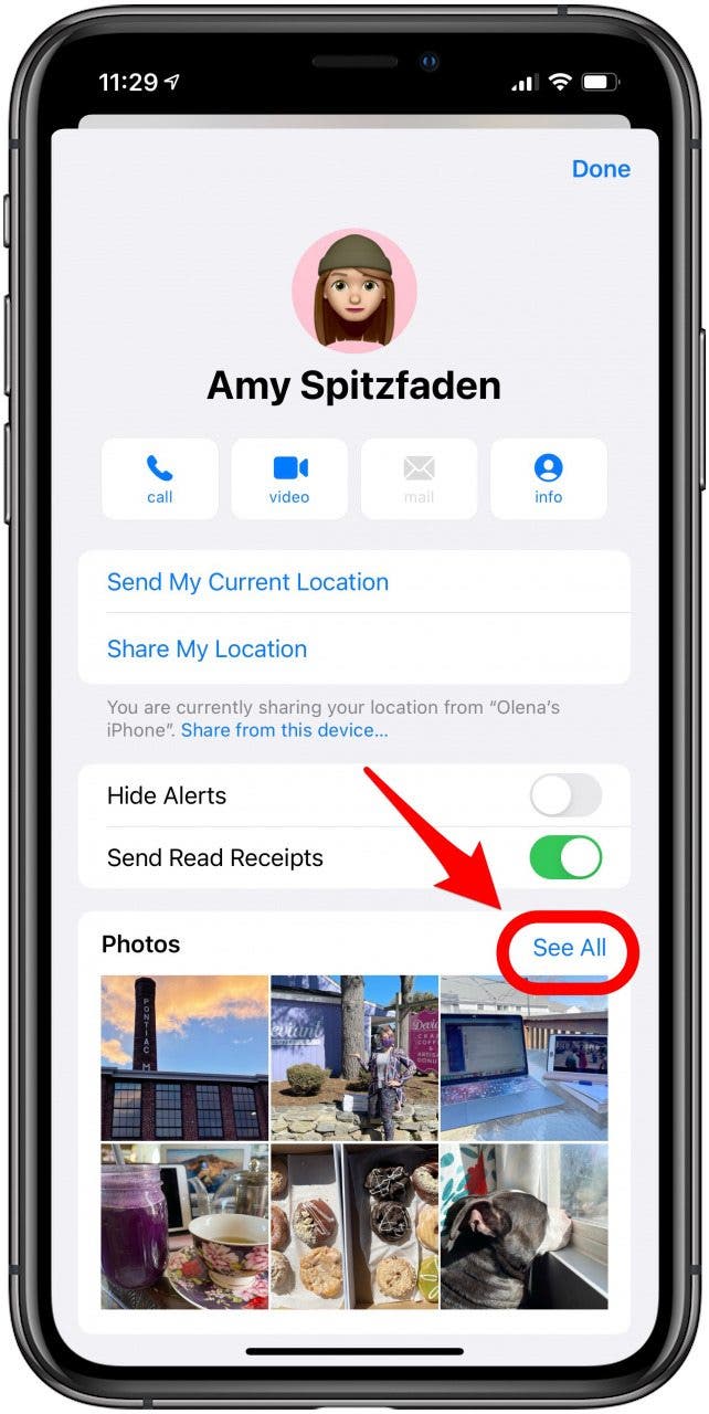 - 否則,如果您不想滾動瀏覽整個消息歷史記錄以查找照片,請點擊您的聯繫人姓名在屏幕頂部。
