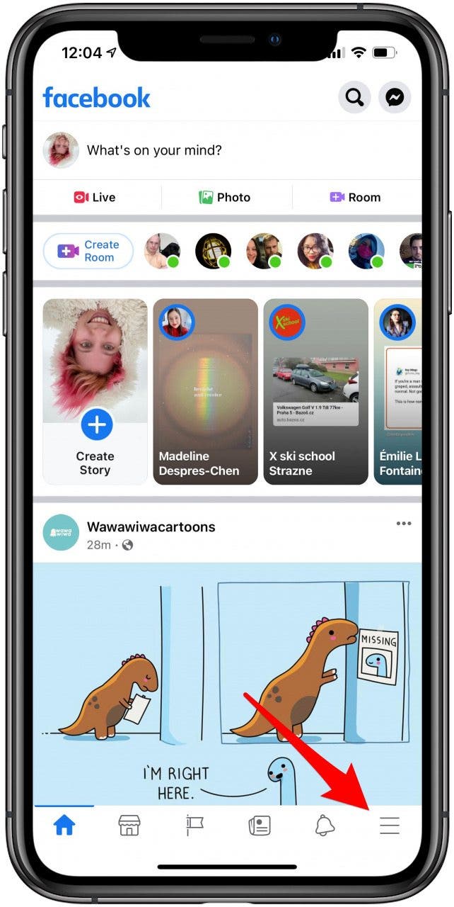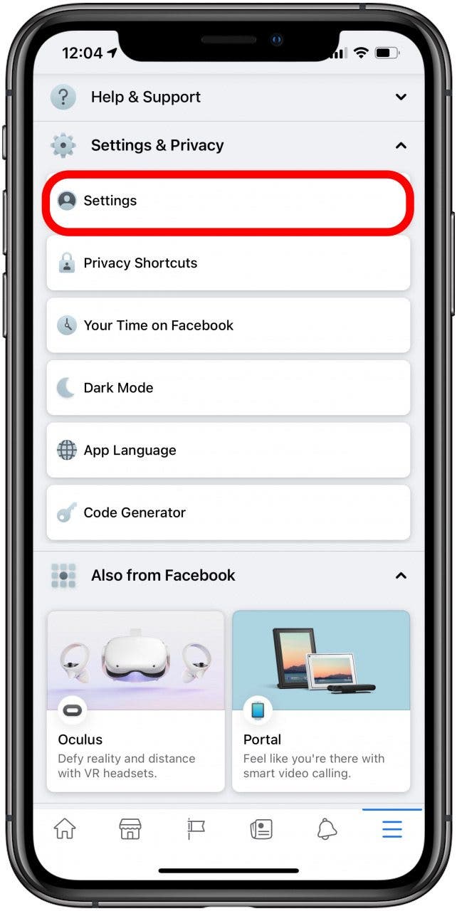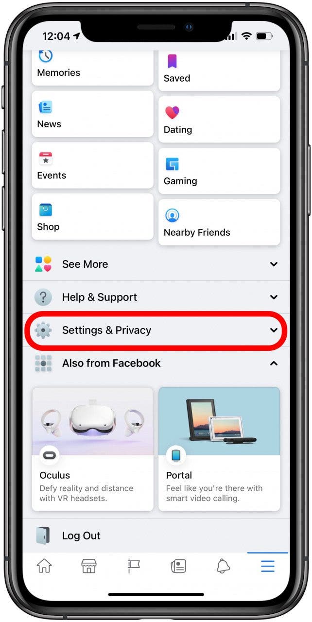 - 點擊打開 Facebook 菜單選項卡菜單圖標,它看起來像屏幕右下角的三個堆疊的水平條。