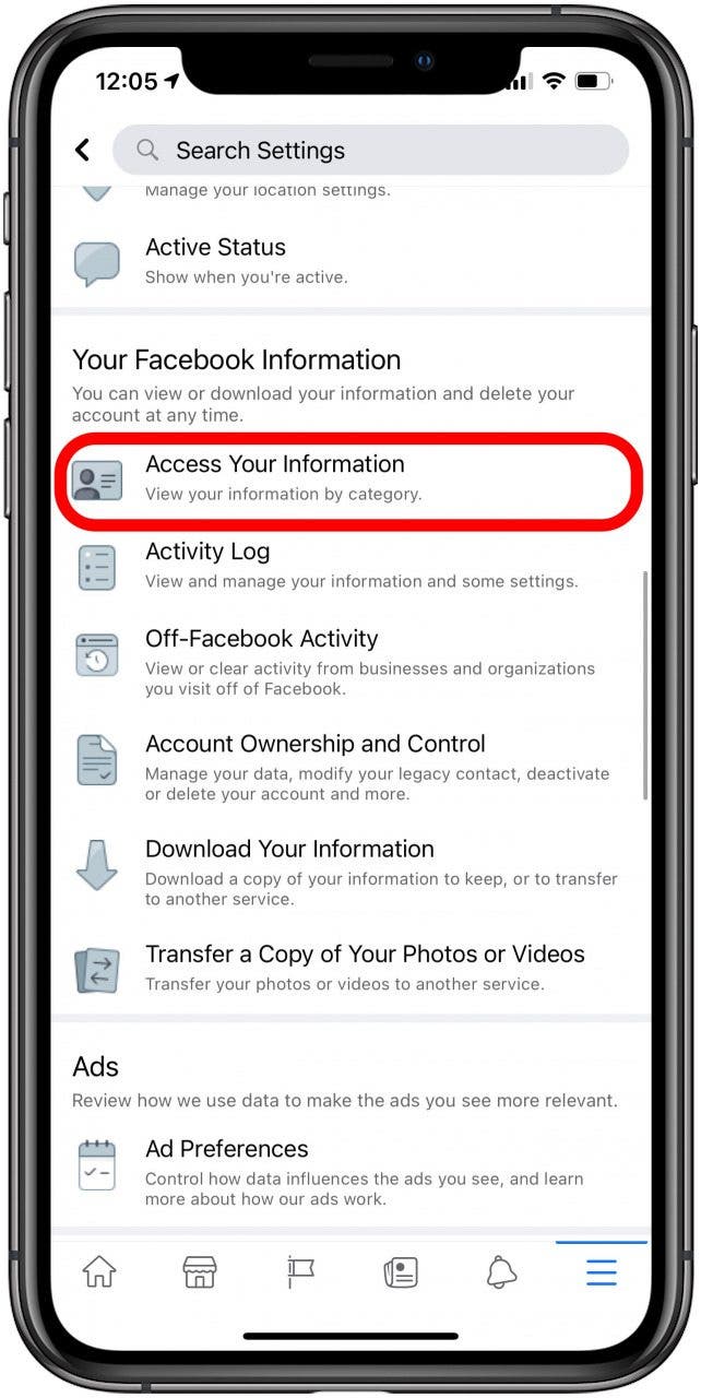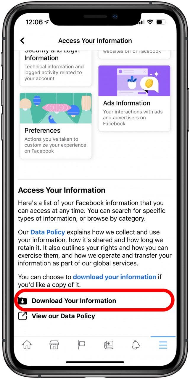 - 向下滾動找到名為的部分您的 Facebook 信息。