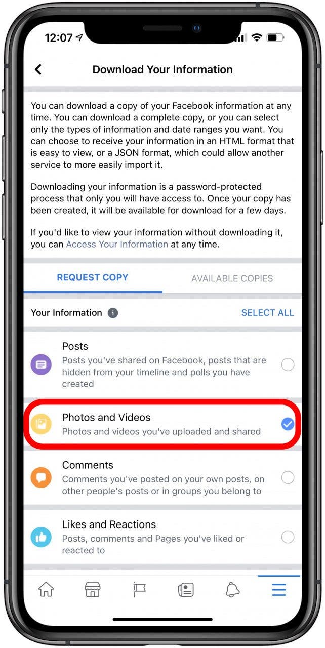 - 現在您可以選擇要存檔的數據。確保僅選擇照片和視頻。如果您願意,可以點擊“全部取消”,然後僅選擇要保存的照片和視頻!