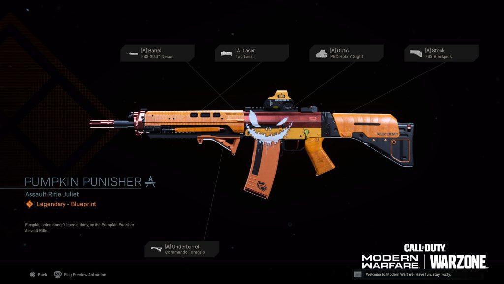 如果您解鎖全部 16 種化妝品,您將自動獲得名為“南瓜懲罰者”的傳奇突擊步槍藍圖,如下圖所示。有關此拾荒者的更多詳細信息,包括所有寶箱位置和所有獎勵的圖片,可以在我們的。